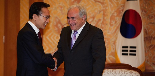 But no one EVER thanks the Fund, and now, with the Western powers traditionally supporting the Fund all bankrupt, the Fund desperately needs Asia. So after a 13 year mexican stand-off over the Fund’s AFC advice, the Fund has finally blinked. It has come back to ask to be let back in. For Korea this was a moment of triumph. Not one Korean speaker missed the opportunity to dredge up the old grievances, and not one IMF speaker had the professional courage to defend the Fund. Even Managing Director Strauss-Kahn (right above) didn’t have the backbone to defend the rescue package that saved Korea from default and an Argentine-style depression. Instead the MD told sob-stories about how the IMF refused to loan money to countries which included cuts in children’s services in their programs. See how nice the IMF is now! 15 years ago they were killing babies, now they are saving them from faceless bureaucrats. Make sure to blast-fax that to all the NGOs and the New York Times. Bleh. Strauss-Kahn has otherwise been a good MD after the last two forgettables. But he sounded so craven it was embarrassing.